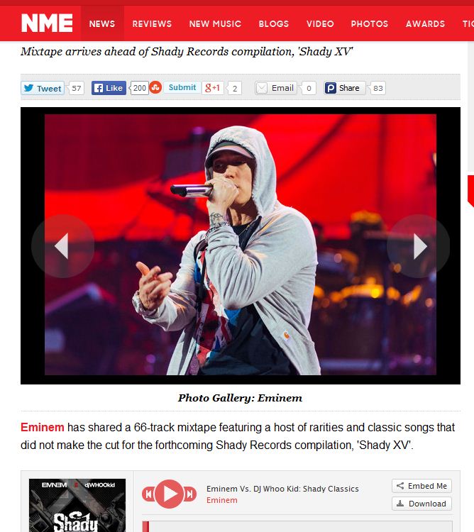 מיקס טייפ חדש של אמינם – 66 טראקים מ-15 שנות קריירה, נדירים וידועים, ואורחים כמו פיפטי סנט וג'יי.זי. אלה השירים שלא הגיעו ל- shady XV , אלבום כפול, המיטב של שיידי רקורדס, שירים מוכרים וחדשים, של אמינם ואחרים בלייבל, כולל החדש שלו עם סיה. עד לאלבום, קבלו את המיקס טייפ. להנאתכם (וקחו את הזמן, כמובן). עכשיו ברשת, באתר nme.com , חופשי לגמרי.